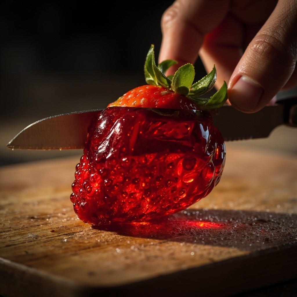 “A hyper-realistic, translucent red jelly strawberry being sliced with a sharp stainless steel knife on a scratched wooden cutting board. The jelly has glossy reflections and tiny air bubbles inside, with green candy-like leaves on top. A human hand gently holds the strawberry while slicing. Dramatic lighting highlights the wet texture and glassy surface. Shot in macro photography style, shallow depth of field, cinematic ASMR mood.”