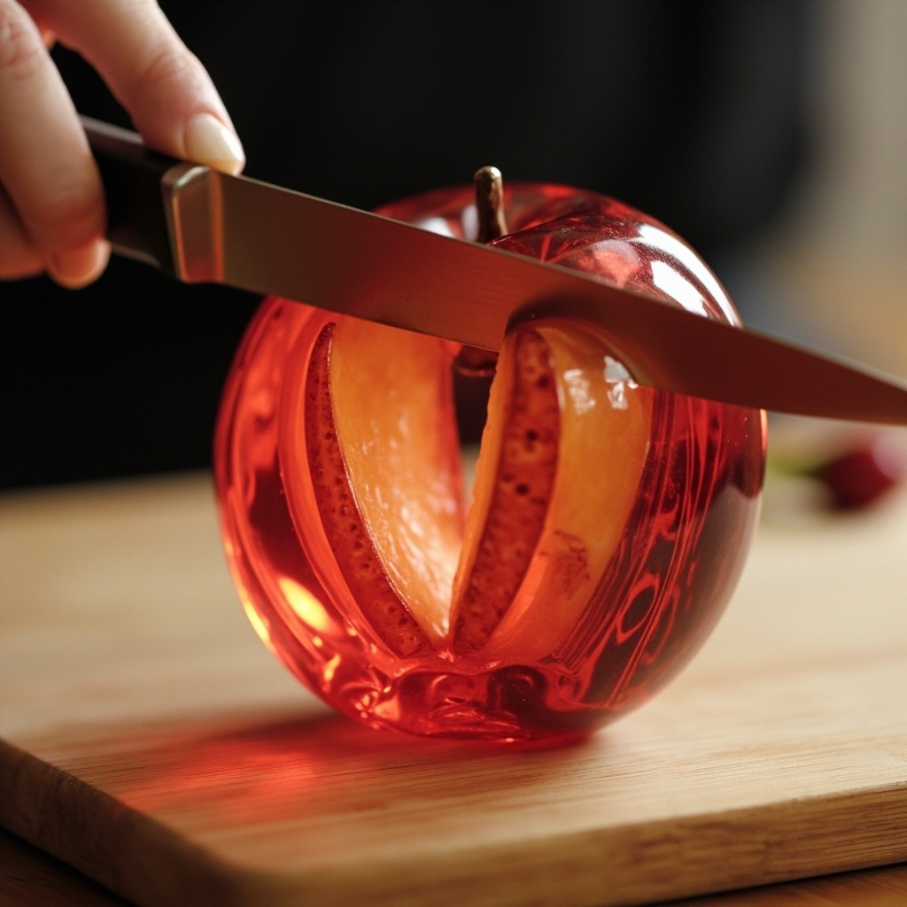 A close-up of a hand holding a knife slicing an apple that looks like transparent glass on a wooden board. An apple made of glass that is extremely realistic and beautiful, resembling a translucent red crystal, is placed on a clean wooden cutting board. The knife smoothly slices through the fruit, creating thin, transparent slices. The sound of the knife cutting through the glass-like fruit is amplified, creating a refreshing ASMR sound. This ASMR video exudes a sense of luxury and elegance, high