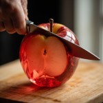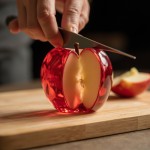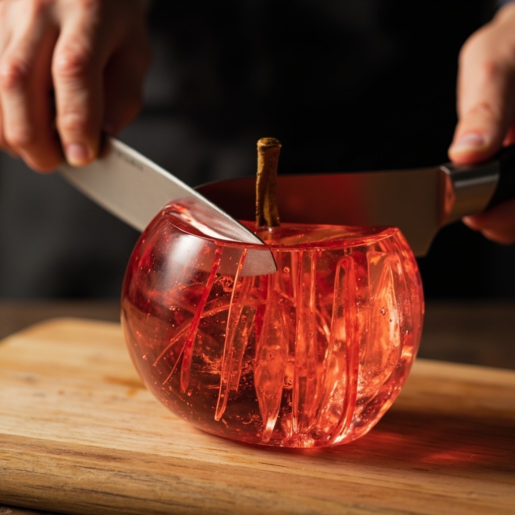 Hand Holding Knife Slicing Transparent Glass Apple on Wooden Board