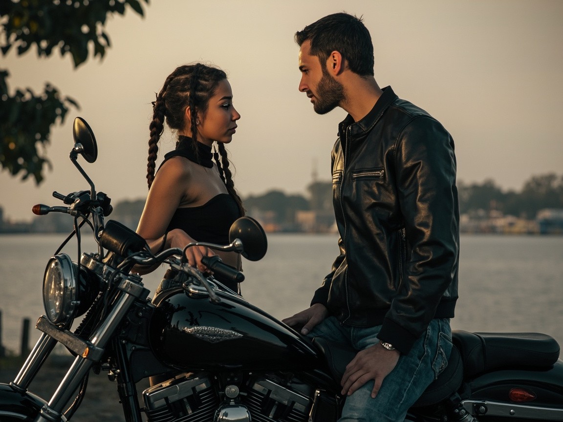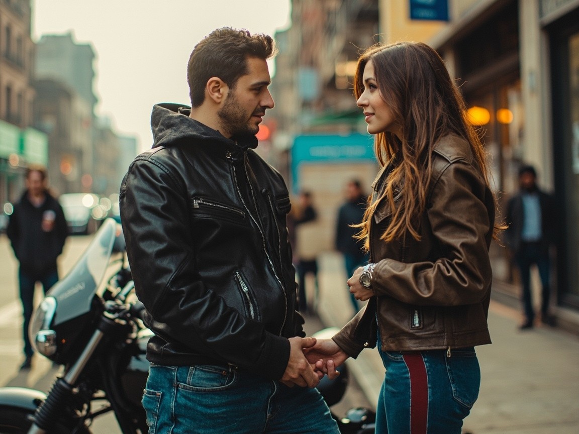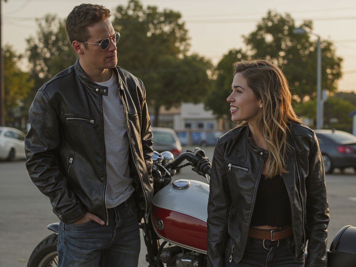 Handsome Man in Jeans and Leather Jacket Beside Motorcycle Looking at Beautiful Girl