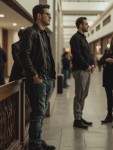 Handsome Man in Jeans, Leather Jacket and Black Shoes Looking at His Girlfriend