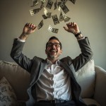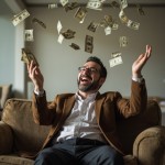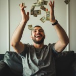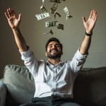 Happy Man Sitting on Sofa Throwing Money Overhead