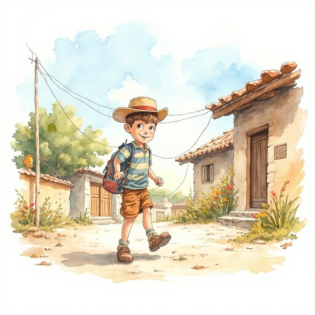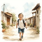 Happy Village Boy Walking Watercolor Illustration