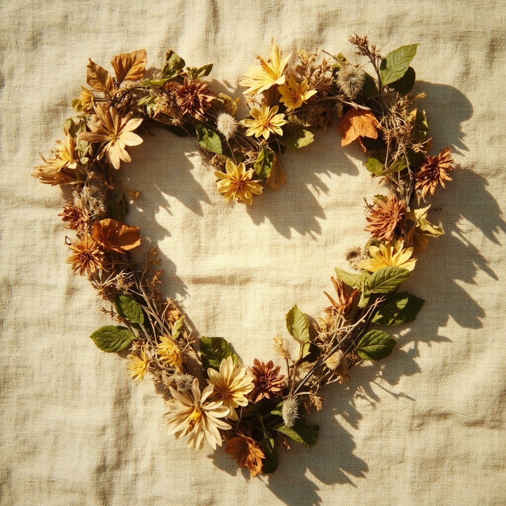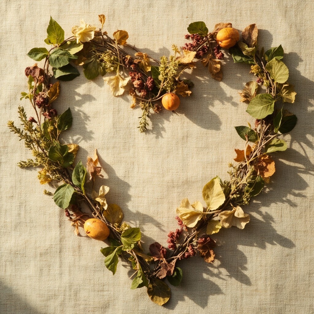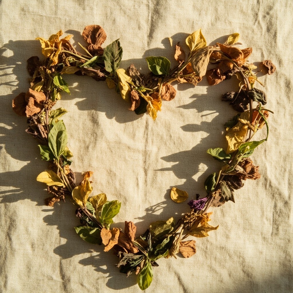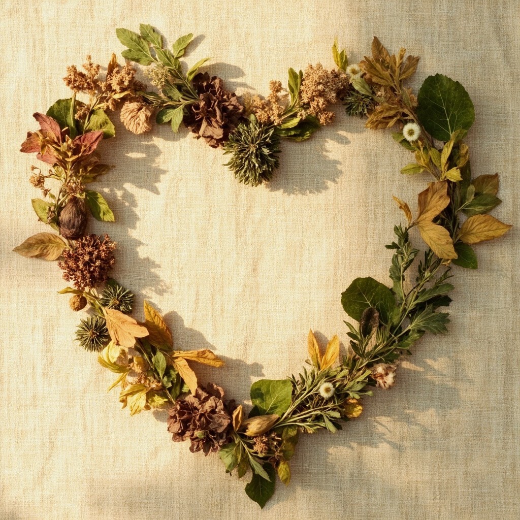Medicinal Herbs Forming Heart Silhouette on Beige Linen Texture