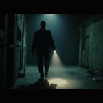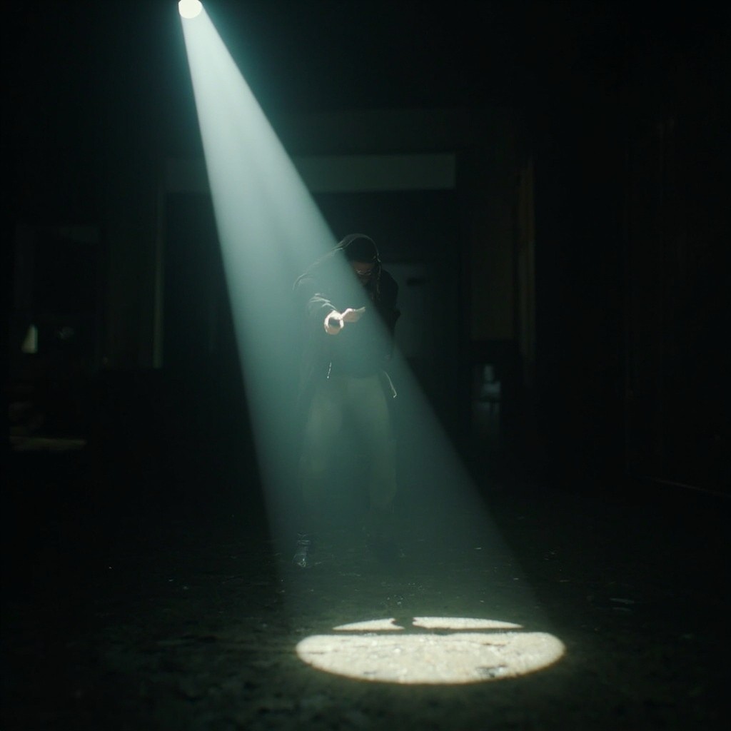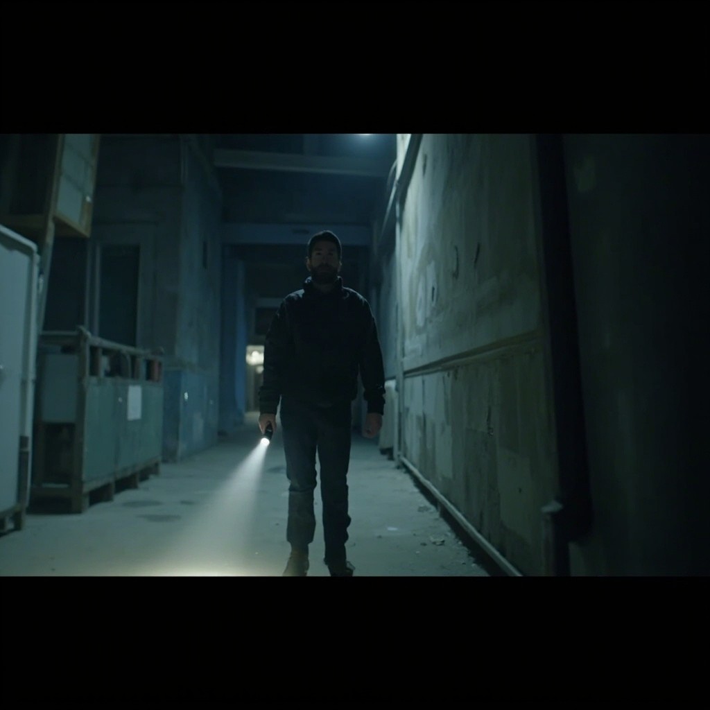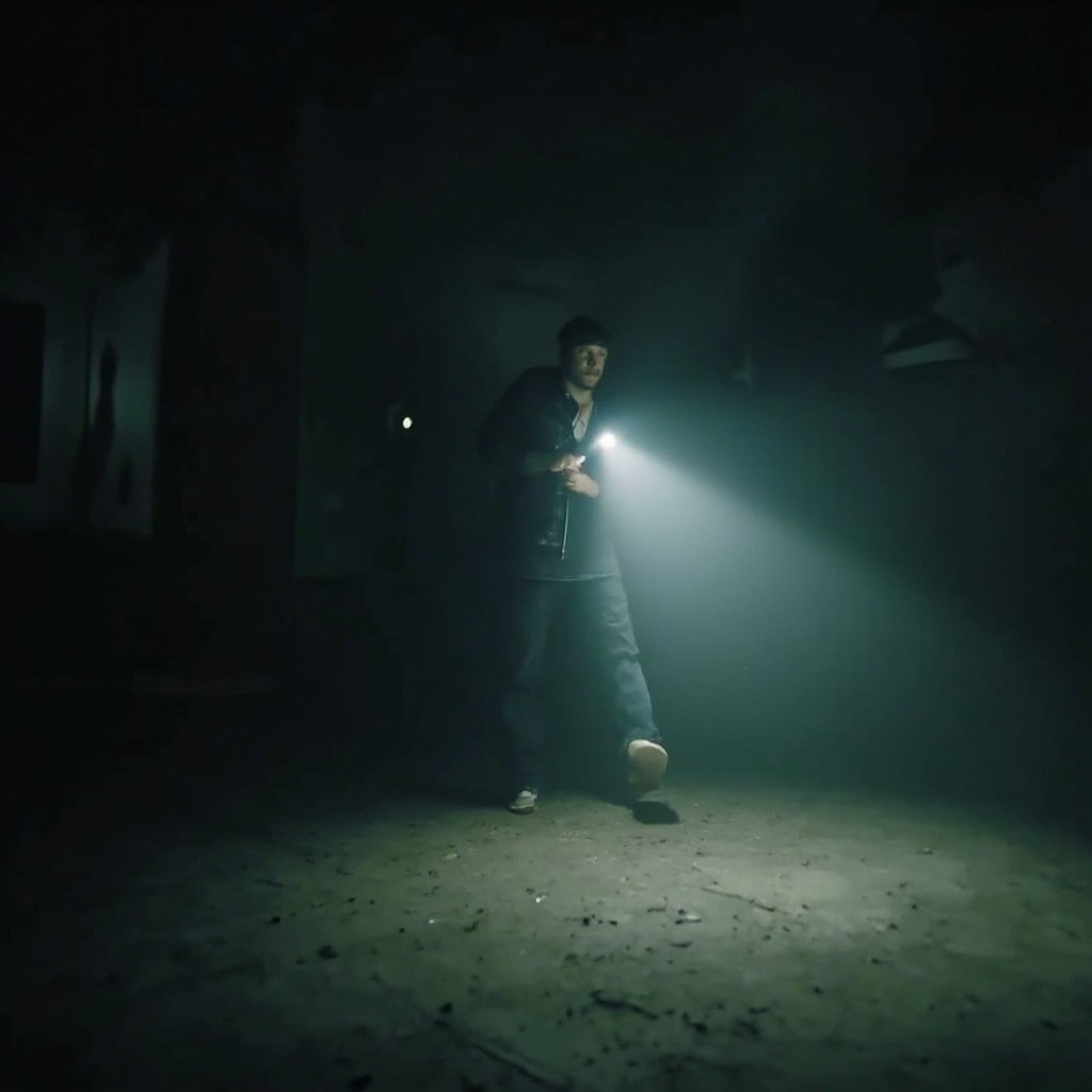 POV video with defined start and end frames. Camera is a real human viewpoint walking slowly in the same location, with grounded motion: subtle vertical footstep bob, gentle side-to-side sway, imperfect handheld movement. Viewer holds a flashlight; the beam reacts naturally with delayed motion, small overcorrections, uneven scanning. The character is completely lifeless at all times-no blinking, breathing, or movement. Only environmental motion is allowed (floating dust, slight light flicker, minimal loose elements). Environment stays consistent throughout: no set changes, teleporting, or new objects. Photorealistic, found-footage realism, low light, strong shadows, gritty textures, natural imperfections.