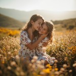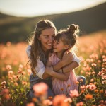 Mom and Daughter Joyfully Hugging in Flower Valley
