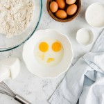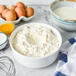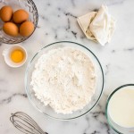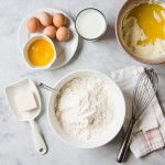 Kitchen Counter With Flour, Whisk, Eggs, Milk, Dishcloth, Bowl