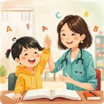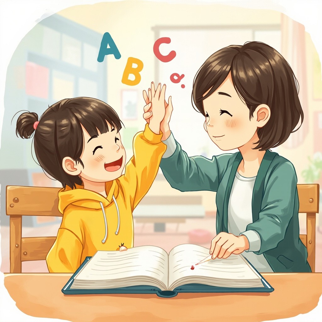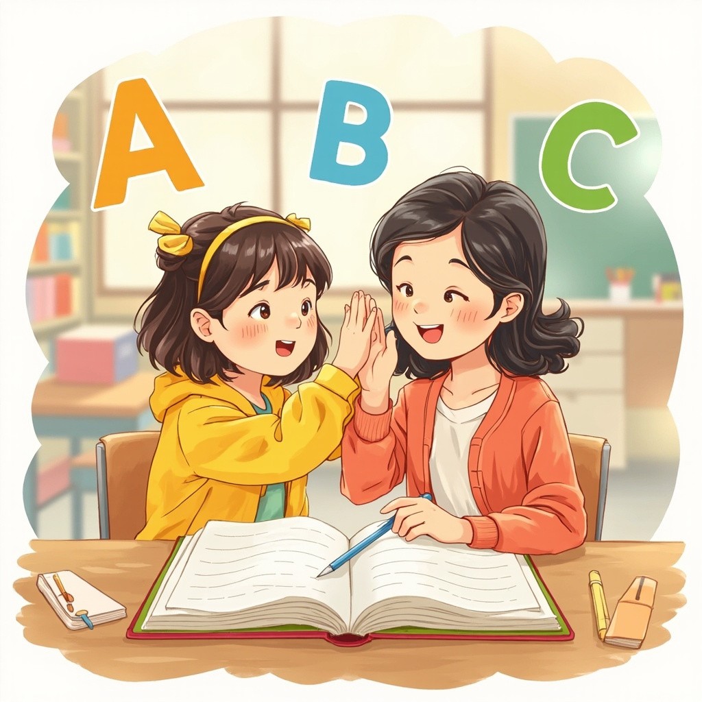 A cheerful, cute illustration style drawing. A Korean elementary school girl in a yellow hoodie and a smiling teacher with short, chin-length hair are high-fiving over an open English workbook. Floating English letters (A, B, C) are around them. The background is a stylized, colorful classroom with pastel tones.