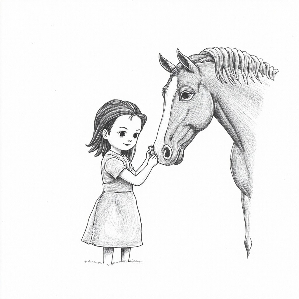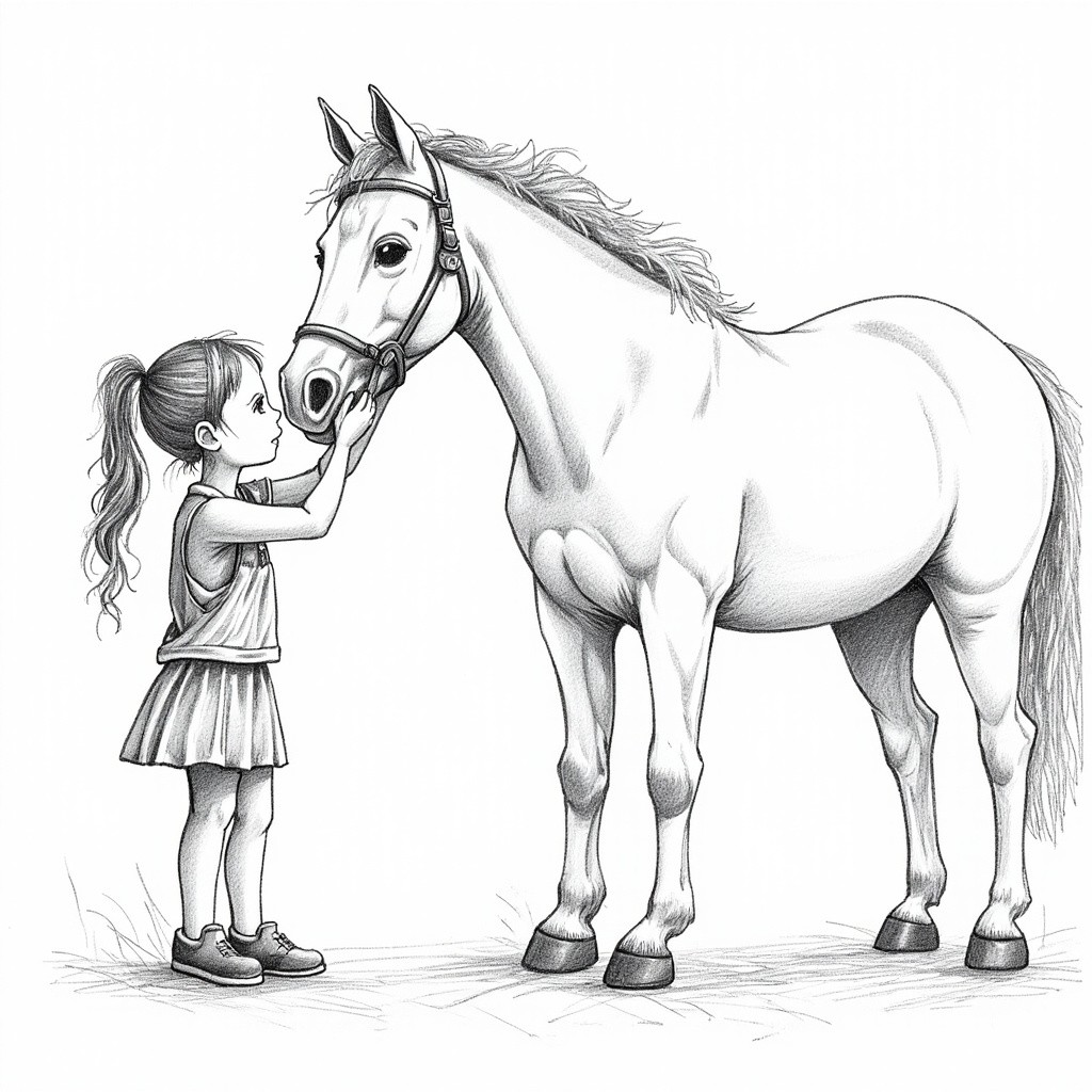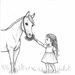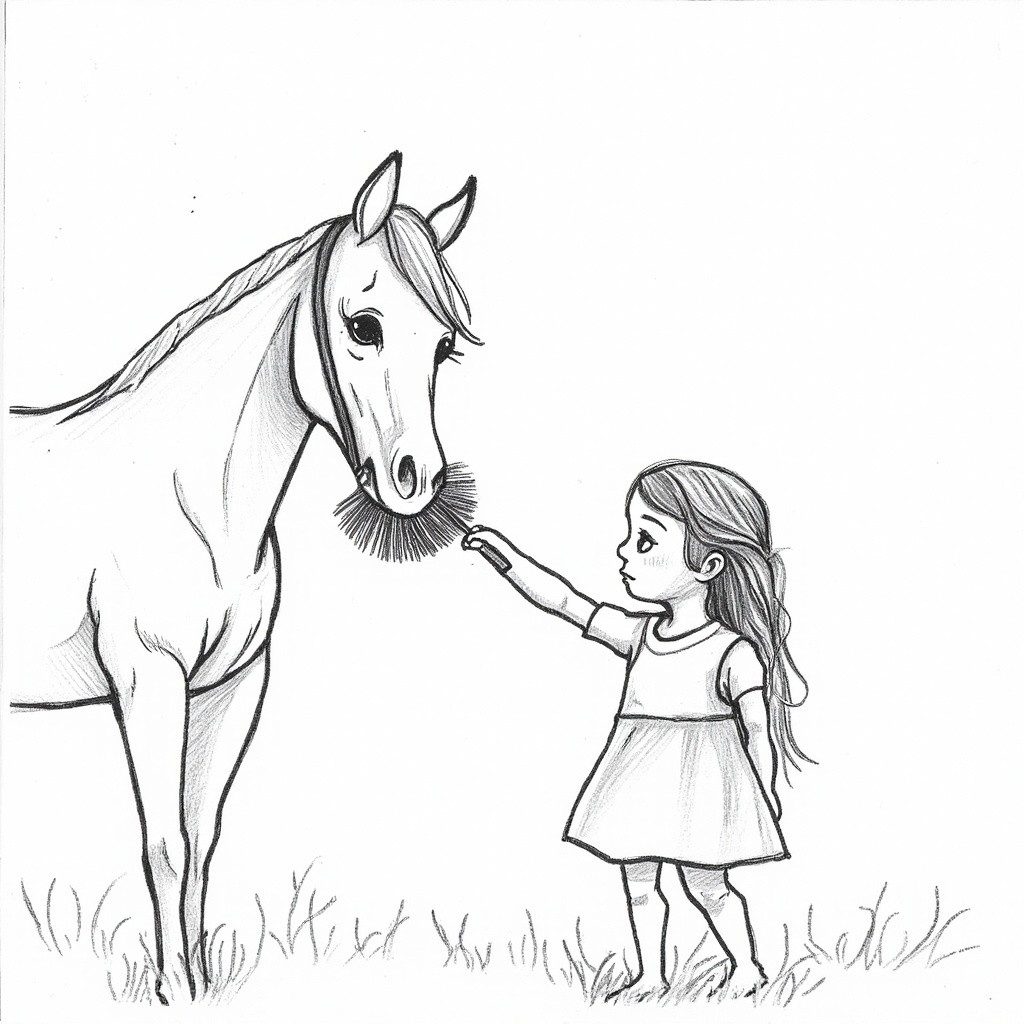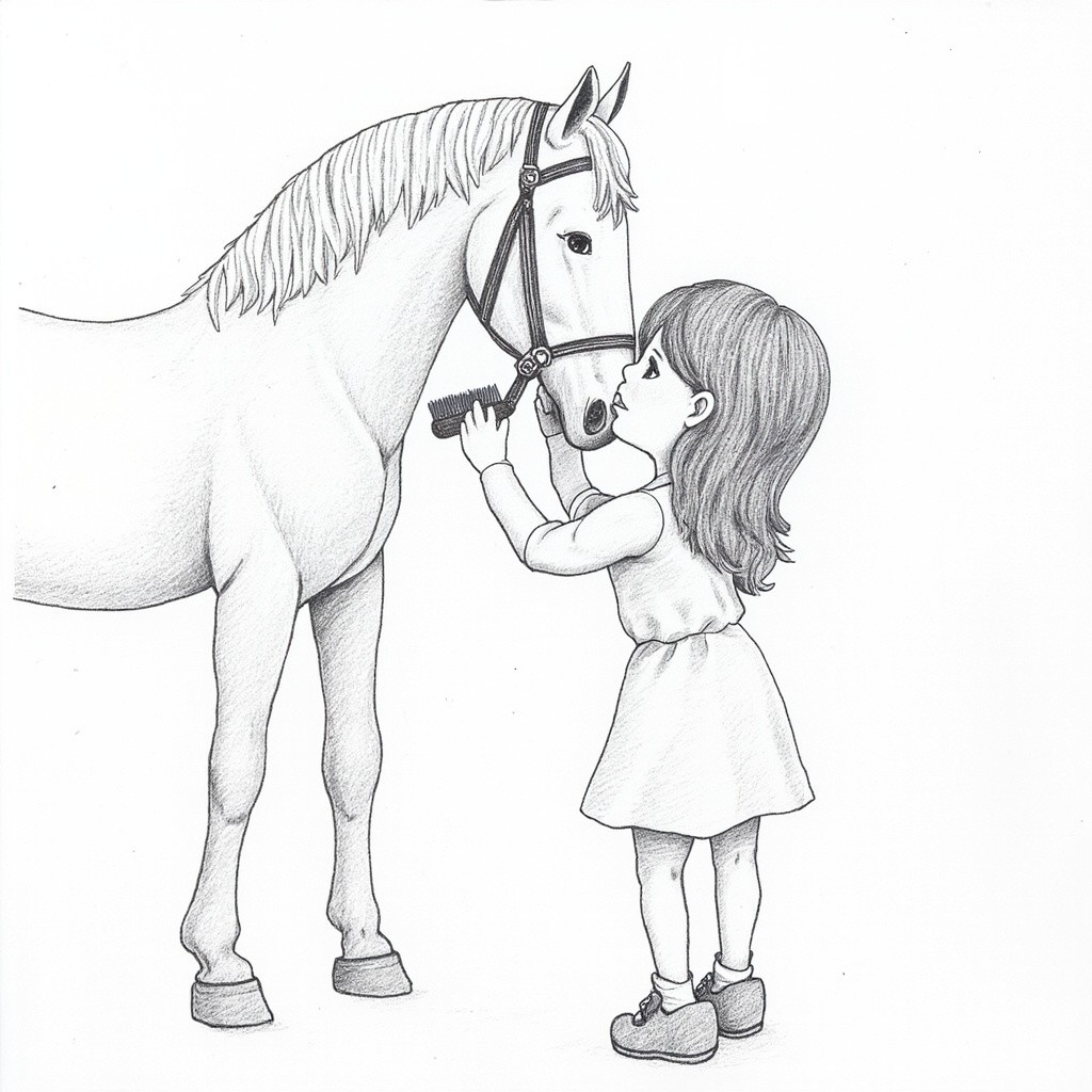 Black and White Pencil Drawing of Girl Brushing Horse's Mane