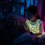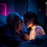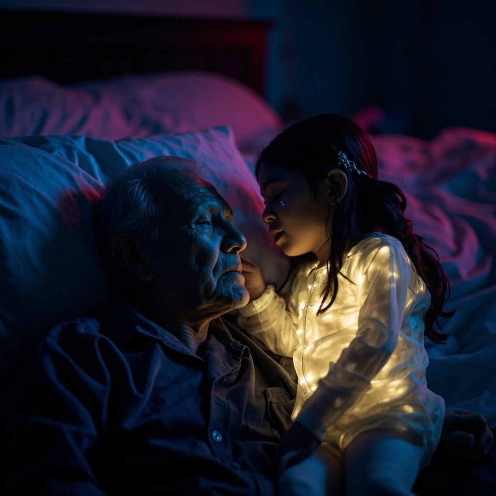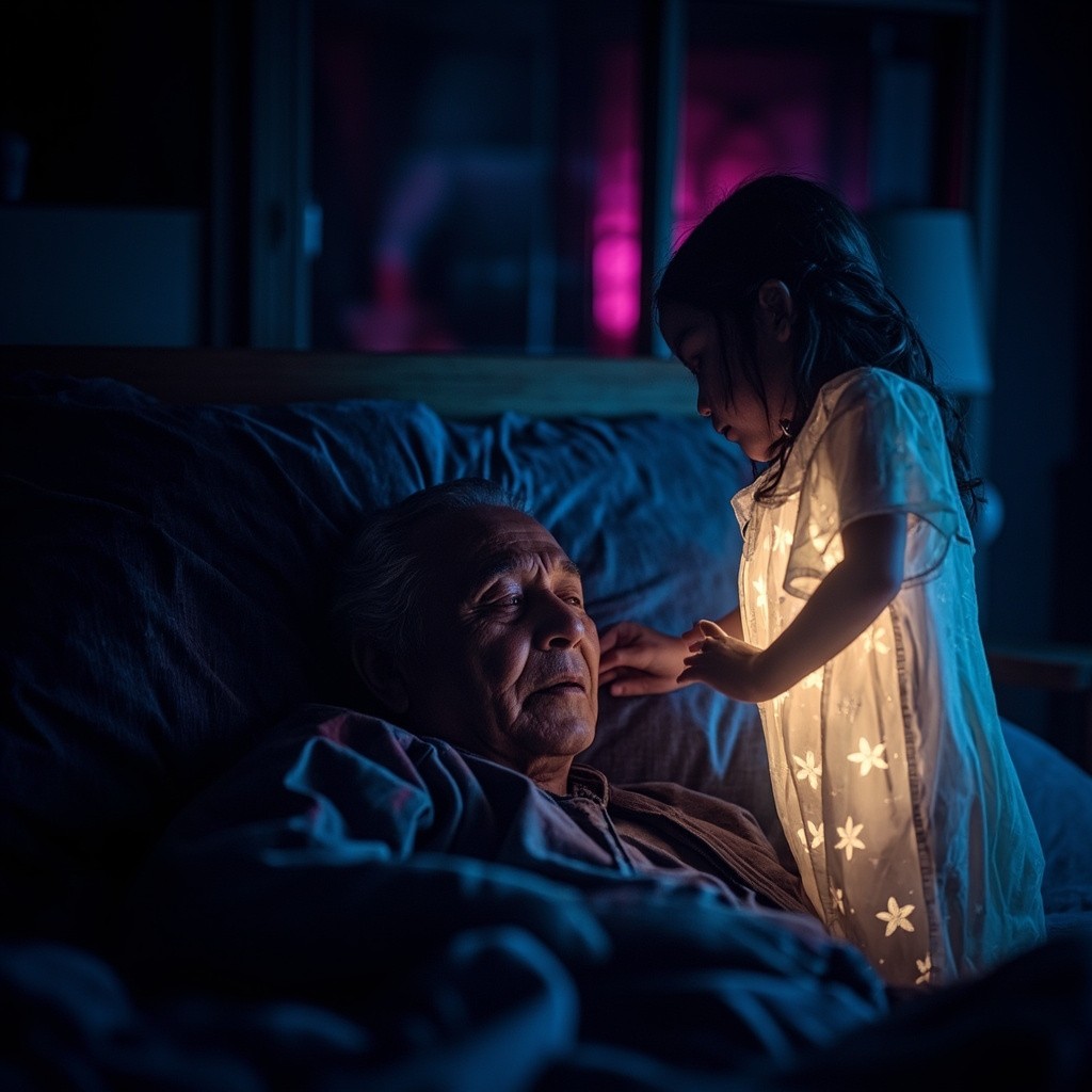 A yuang indian line on his bed at night wearing dark night clothes. Room glows softly with neon blue and pink light creating a moody at mas phere beside him standing the glowing spirit of an Indian girl her body emitting a gentle golden white aura she look at him lovingly.with her hand pleced soptly on his cheek.a single tear rolls Clown from the man eyes as he sleeps. Feeling her presence without waking.the room around them is dim and guit filled with emotion and nostalgia keep my face 100%same as in the reference image video