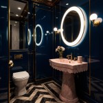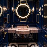 Luxurious Powder Room with Midnight-Blue Walls and Gold Geometrical Inlays