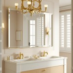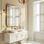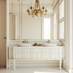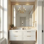 Modern Luxury Bathroom with Gold-Trimmed Mirror and Chandelier
