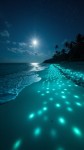 A serene beach at night under a starry sky, with gentle waves washing ashore. The sand glows with ethereal bioluminescence, casting a soft, magical blue-green light across the shoreline. Moonlight reflects off the calm ocean, and distant palm trees sway gently in the night breeze. The scene is peaceful and dreamlike, with sparkling particles in the sand creating a glowing trail where footsteps have passed. Shot on a Canon EOS R5 with a wide-angle lens, cinematic lighting, high-resolution detail, and a mystical atmosphere.