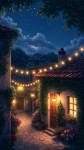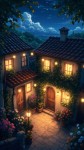 glowing lanterns, flowering plants and ivy, rustic tiled rooftops, hanging lights, peaceful ambiance, soft shadows, ghibli-inspired, warm glow, ultra detailed, cinematic composition, A cozy Mediterranean courtyard at night, centered around a small charming house with terracotta roof tiles and warm wooden door, illuminated by soft golden string lights hanging across rooftops and between houses. Potted flowering plants like bougainvillea, petunias, and geraniums line the stone-paved courtyard and windowsills. The house facade glows warmly from the interior light, casting soft shadows. The sky is a rich twilight blue with scattered glowing clouds, stars peeking through, and tree branches with lush green leaves and small fruits framing the top edges of the scene. The ambiance is peaceful, dreamy, and romantic. Detailed anime-style with soft lighting, intricate textures, and a magical, storybook atmosphere.