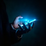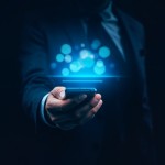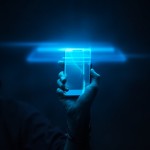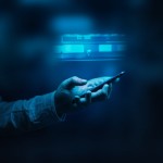 Man Holding Smartphone with Glowing Blue Digital Interface