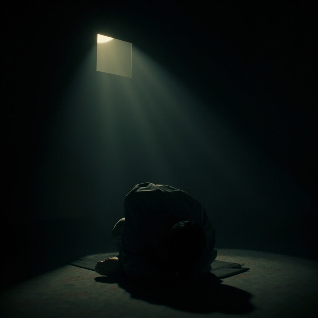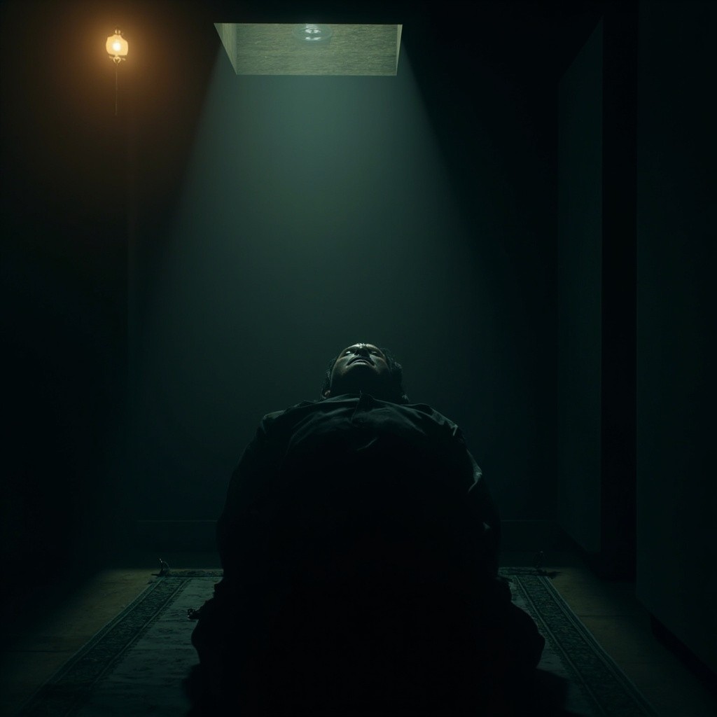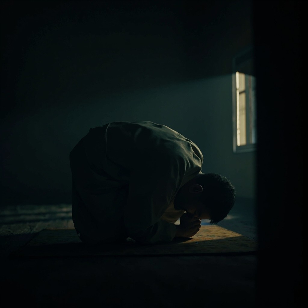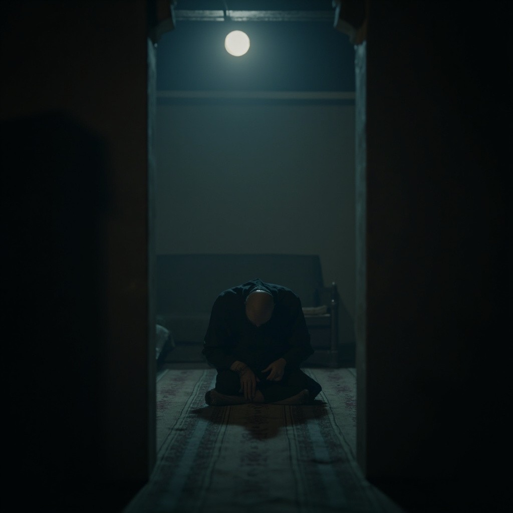 Ultra-cinematic realistic 3D image of a lone man in deep sujood during Tahajjud prayer, inside a small quiet room at night. The man is prostrating on a simple prayer mat (janemaz), head lowered, body fully in sujood, face not visible. Camera point of view is from the upper corner near the ceiling, as if someone unseen is gently observing from above. Soft moonlight or faint warm light enters the room, creating long shadows. The atmosphere is emotional, silent, and spiritually heavy, expressing humility, tears, and desperation before Allah. Minimal interior, plain walls, no decorations, no distractions. Low-key lighting, cinematic shadows, realistic textures, deep contrast, sacred solitude, strong sense of divine presence without showing anything divine. Photorealistic, movie still quality, 8K look, emotional realism, aspect ratio 16:9