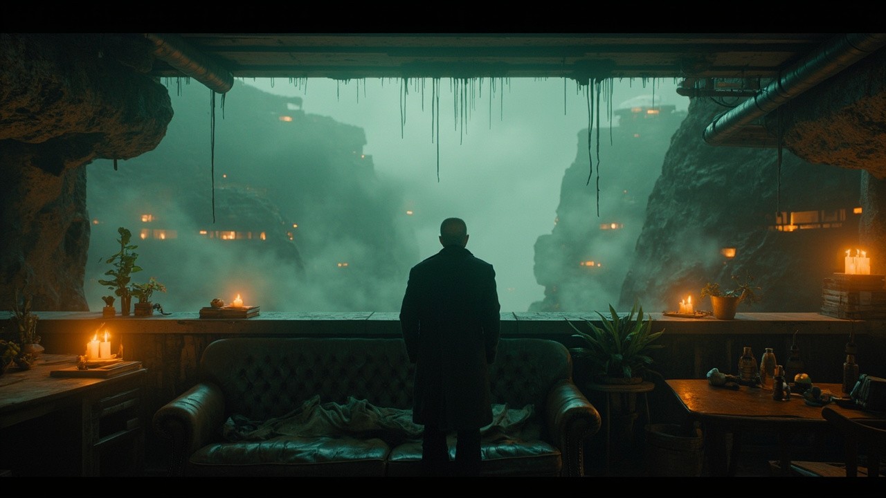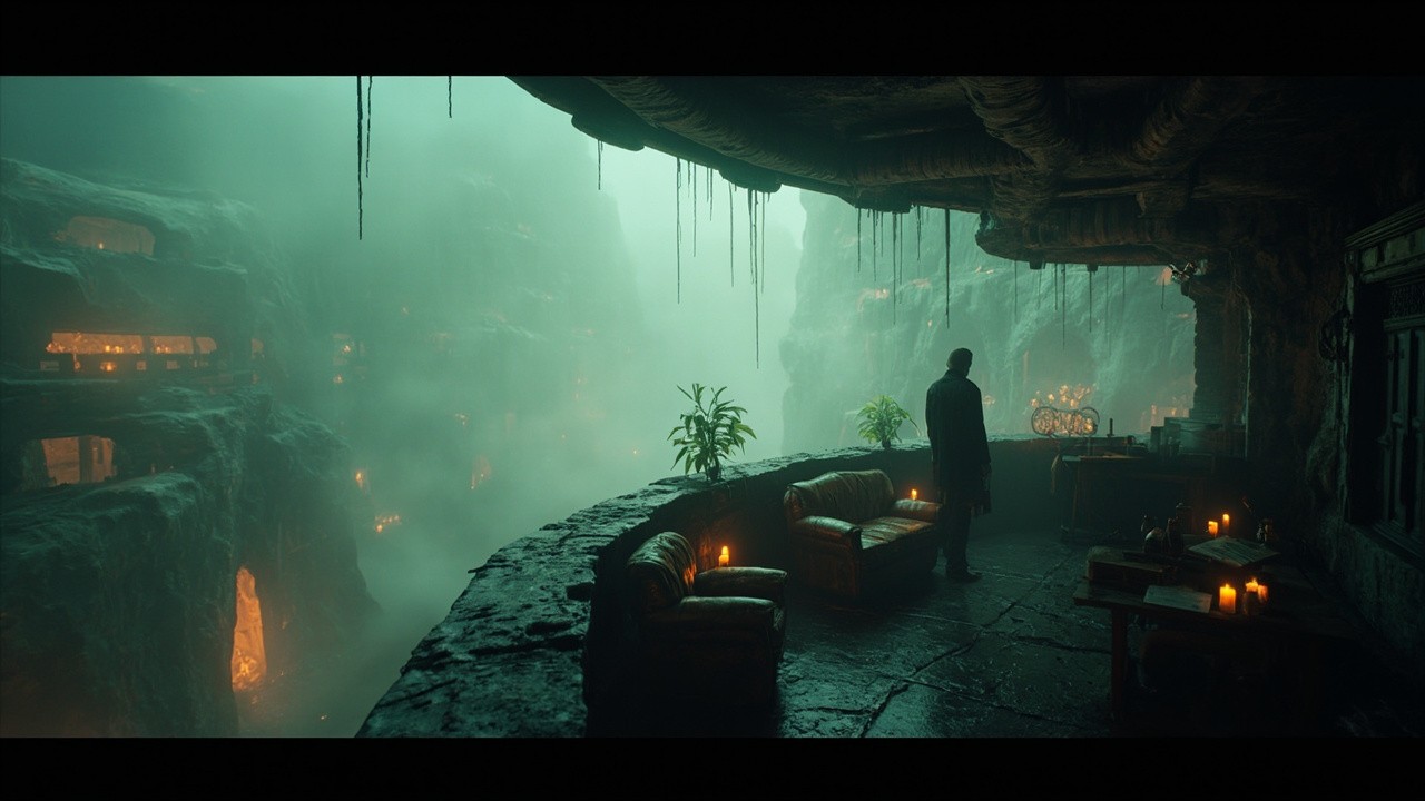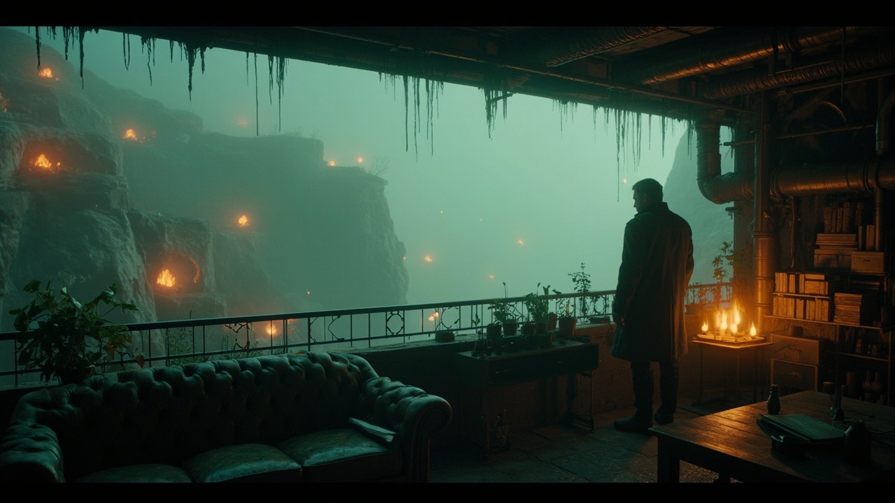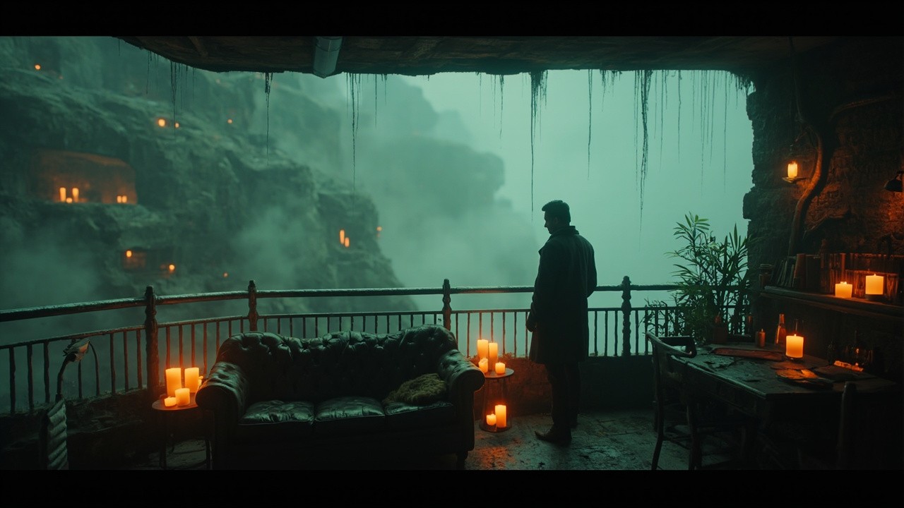 A moody, cinematic balcony view in a dystopian futuristic world, overlooking mist-covered cliffs filled with glowing orange lights and hidden structures built into the rock. A solitary man in a coat stands beside a worn leather sofa, surrounded by warm candlelight. The atmosphere is foggy and mysterious, with a soft greenish-blue hue in the background and dripping ceiling pipes above. The interior is dimly lit, with books, plants, and old bottles on a wooden table, evoking a post-apocalyptic yet cozy refuge. Realistic style, high detail, volumetric lighting, 4K.