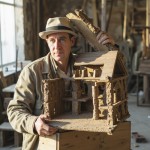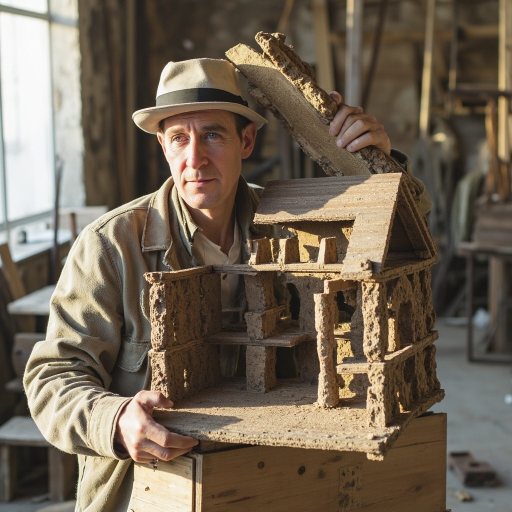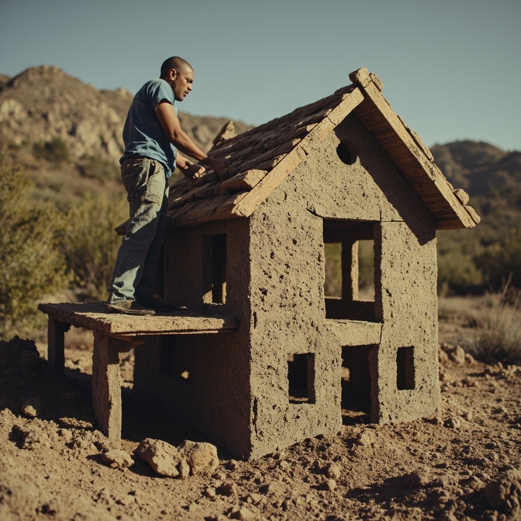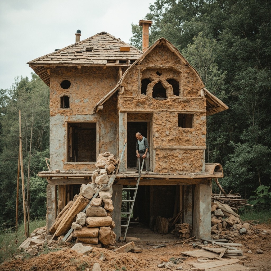 Man Building House and Creating Sculptures