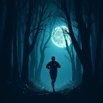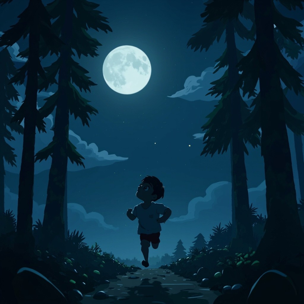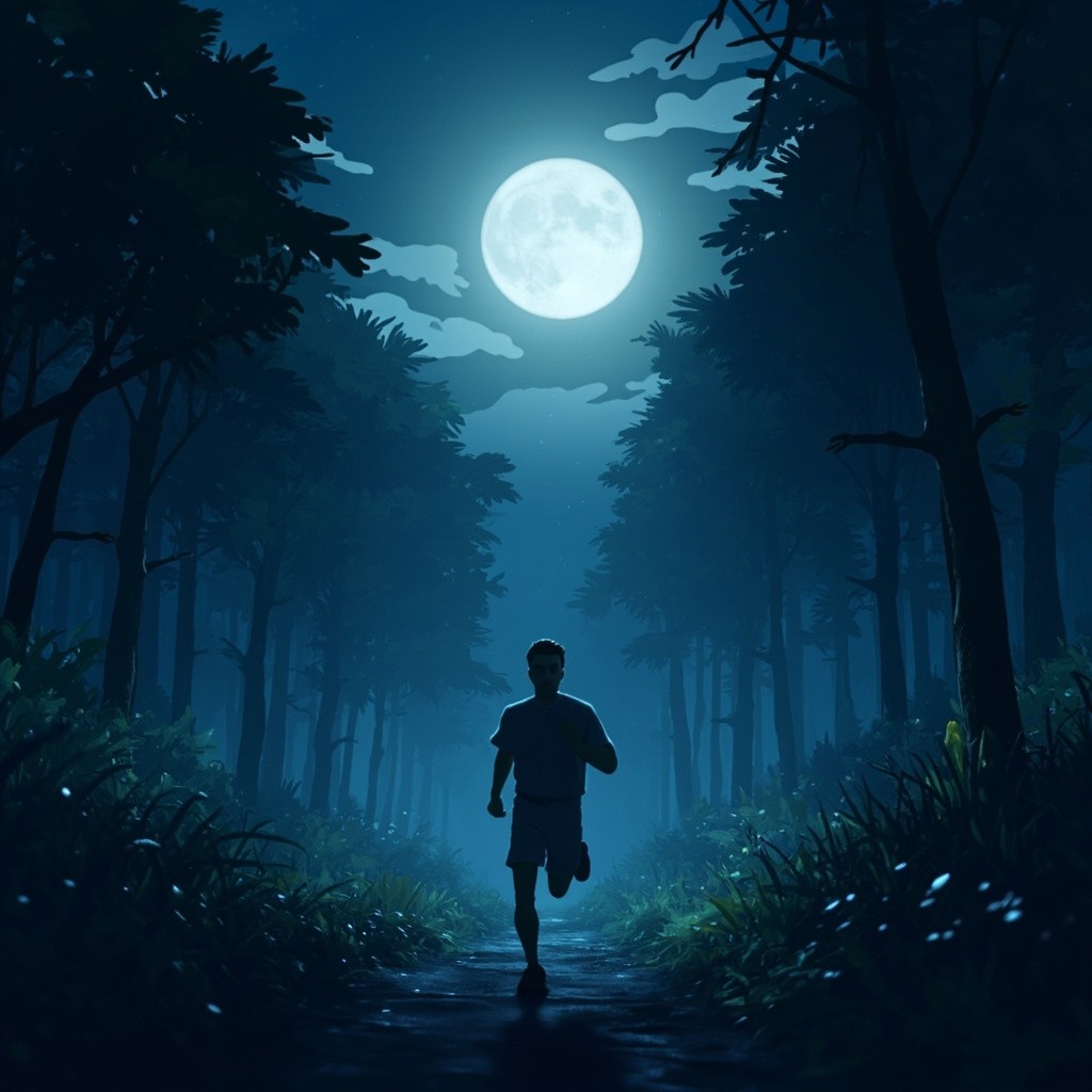 Animation Scene of Man Running in Dense, Moonlit Forest