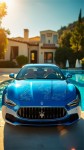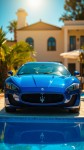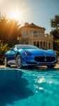 Under the sun, a blue Maserati with perfect and rich body texture details, complete small details, and rich light energy texture, parked next to a deep blue, clear bottomed swimming pool, with a sun view villa in the background. The luxurious appearance of the villa was captured using Canon and Sony cameras in high definition and realism. The best looking photos were selected and posted on social media, receiving likes from fashion masters,32K