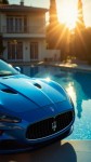 Blue Maserati Parked by Deep Blue Swimming Pool with Sun View Villa Background