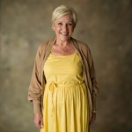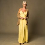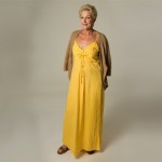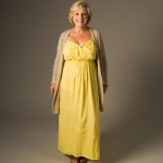Blonde Woman Over 40 Wearing Lemon Yellow Maxi Dress and Tan Cardigan