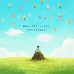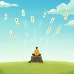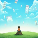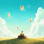 Create an animated illustration video scene: a calm, stylized illustration of person meditating on a tree stump in a vast field. Around them, from everyone sides, animated portraits/posters of every side of similar figures gently float and drift upward into a bright blue sky with soft clouds. Mood is peaceful, reflective, slightly surreal.
