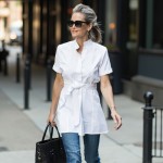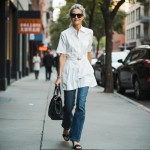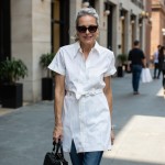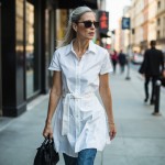 Show the full image from head to toe. Use this garment from Amazon: Norma Kamali Women's Super Button-Front Neck Shirt Flared Mini Dress in white poplin, featuring a self-sash and short, sleeves for coverage. Dress ends at 6" above knee. Hem is even. Show it on a 40-year-old woman with with a messy pony tail. Her hair is grey. she is wearing this dress with denim fitted flared jeans and high heel black sandals. she is in a city setting and is carrying an Italian black leather woven bag with hands.