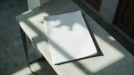 a photorealistic, hyperrealistic image of a an a4 poster sitting on a concrete table in an urban room. The framing of the image is a little offset and framed artistically to make for a less rigid visual, but it still looks intentional - focus is on the posters in a bright publication house room. It's minimalistic and the poster is very slightly cropped out of frame at the bottom left corner and the shot is taken from directly above. The contrast is high with graphic shadows. shot with a 50mm camera lens in an urban, editorial space. keep it cool and minimal and mostly monochromatic but well lit with a high white point and a high contrast black point. bright studio lighting . visual is urban, editorial and a high-quality, professional product shot that will be used for a behance design portfolio mockup