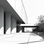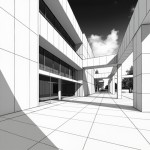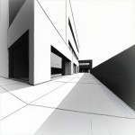 A black and white architectural rendering of a modern building, viewed from a 45-degree angle in strong linear perspective. Sharp lines, high contrast shadows, dramatic depth, minimalistic style, with clear vanishing points. The scene should feel artistic and clean, similar to architectural sketches or concept illustrations. No color, only monochrome tones