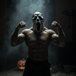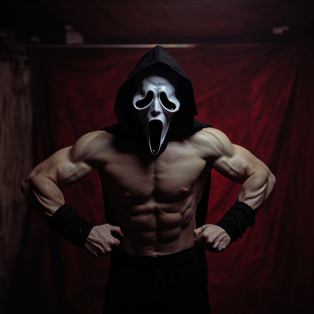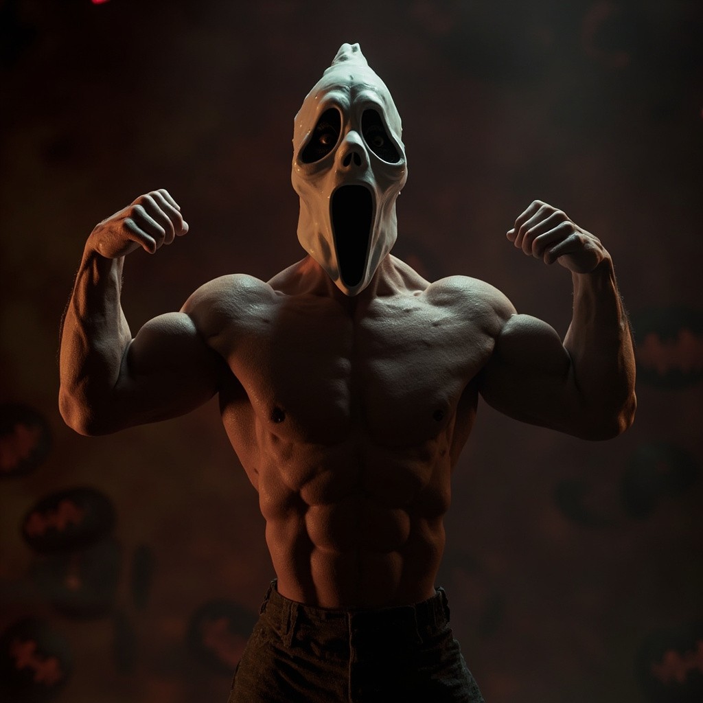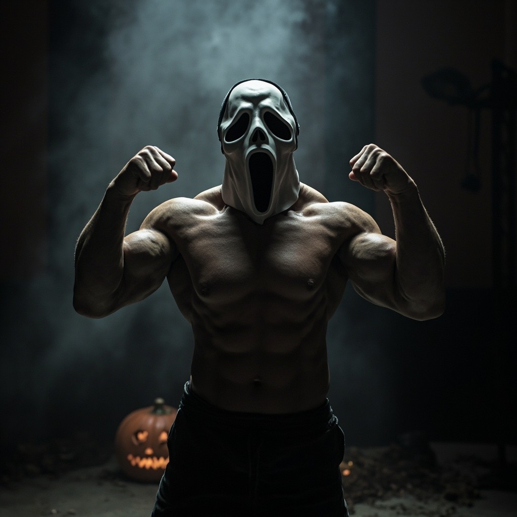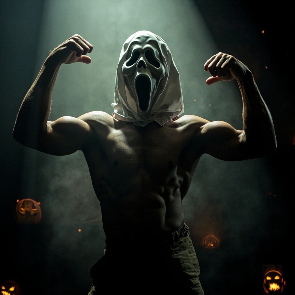 Muscular Man with Ghost Mask Flexing on Halloween Stage