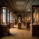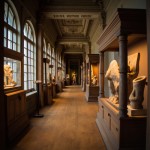 Museum hallway with some archeological artefacts from some different old civilisations in wodden showcase. The hallway’s ceiling is with some mold and beam. Baroque style. Point of view of the wall with windows at the left (the Wooden showcase in front) at the center an egyptian statue. We see only one row of showcases, at the rigorismes it’s cropped. The floor is in wood too. The vanishing point of the perspective is at the right corner