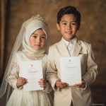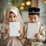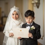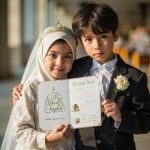 Muslim Girl in Wedding Dress and Boy in Groom Attire Holding Invitations
