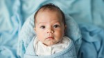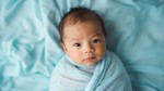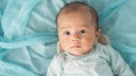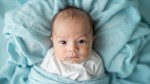 Overhead View of 15-Day-Old Baby on Soft Sky Blue Fabrics