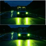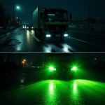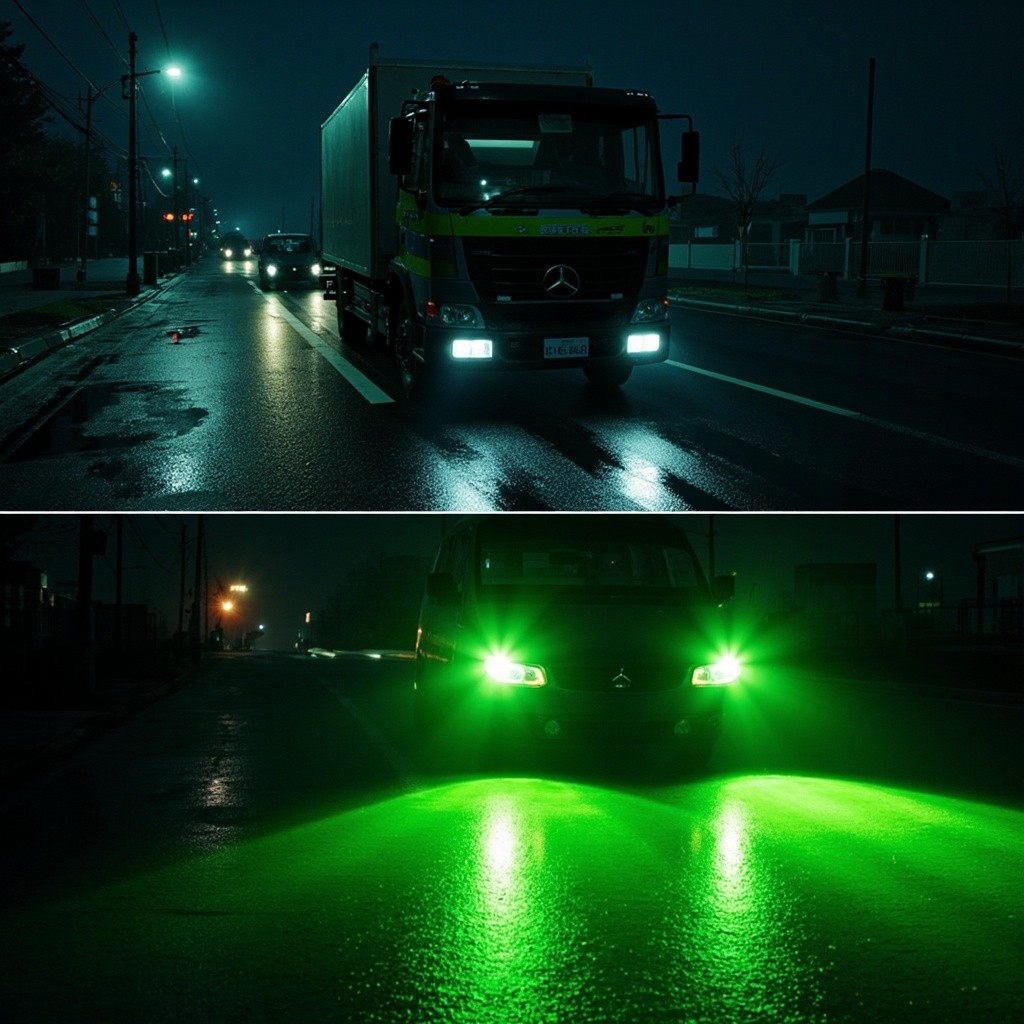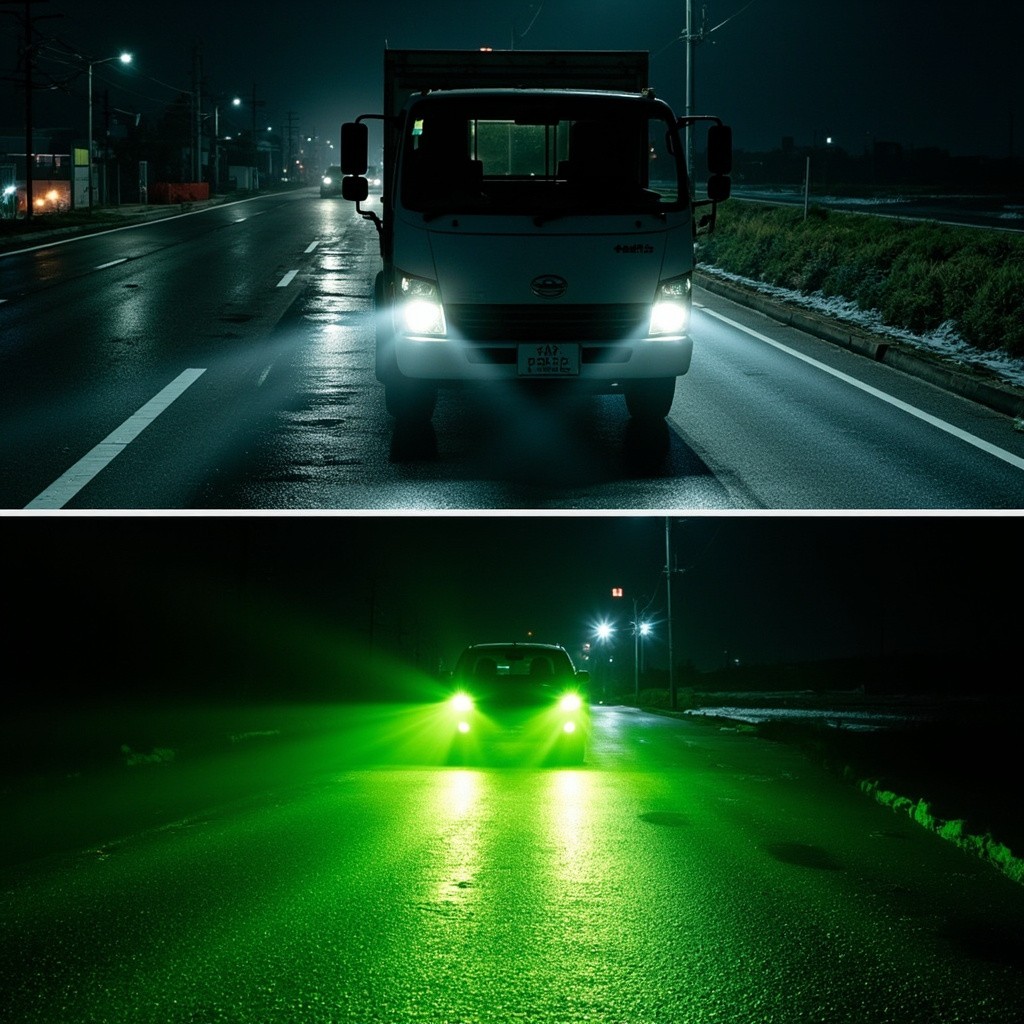 First-Person View of Japanese Truck Driving at Night on Wet Road With Bright Lime Fog Lights