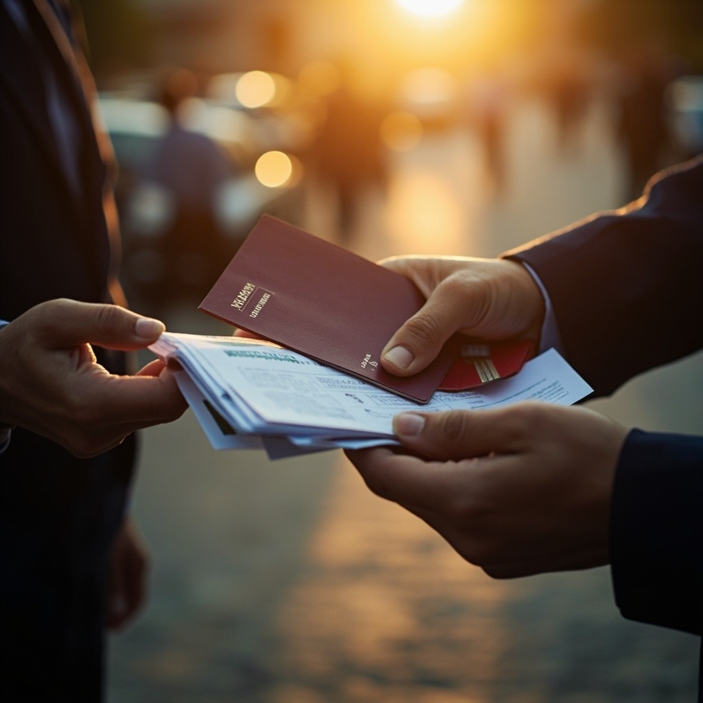 A highly detailed, hyper-realistic shot in landscape orientation from an over-the-shoulder perspective. Two hands gently handing over a set of official documents (a burgundy passport, a red work patent card, and some receipts) to another pair of hands. The hands are positioned further away from the camera, creating more space in the composition. The receiving hands are wearing the dark blue fabric of a police uniform sleeve. The scene conveys trust and peaceful interaction. Soft, warm sunset light creates a golden rim light on the edges of the hands and documents. Cinematic composition, shallow depth of field, the background is completely blurred (bokeh). The documents are softly blurred with no visible details or text — only their colors and shapes are recognizable. Focus is on the overall scene and the gentle gesture of handing over. 8k, shot on 50mm lens, f/1.4, natural skin texture, soft lighting