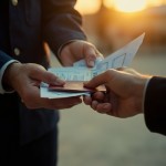 Over-The-Shoulder Shot of Hands Exchanging Official Documents under Sunset Light