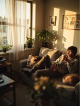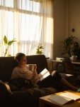 A cozy, sunlit weekend morning scene in a modern apartment — soft light streaming through sheer curtains, a person lounging with a coffee mug on a comfy sofa, a book in hand, with a dog curled up beside them. Records playing in the background, houseplants around, and a sense of peaceful relaxation. Warm tones, candid, lifestyle photography aesthetic.