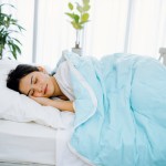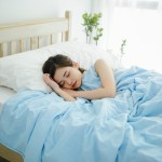 Person Sleeping on Bed with Light Blue Cotton Quilt and White Room Decor