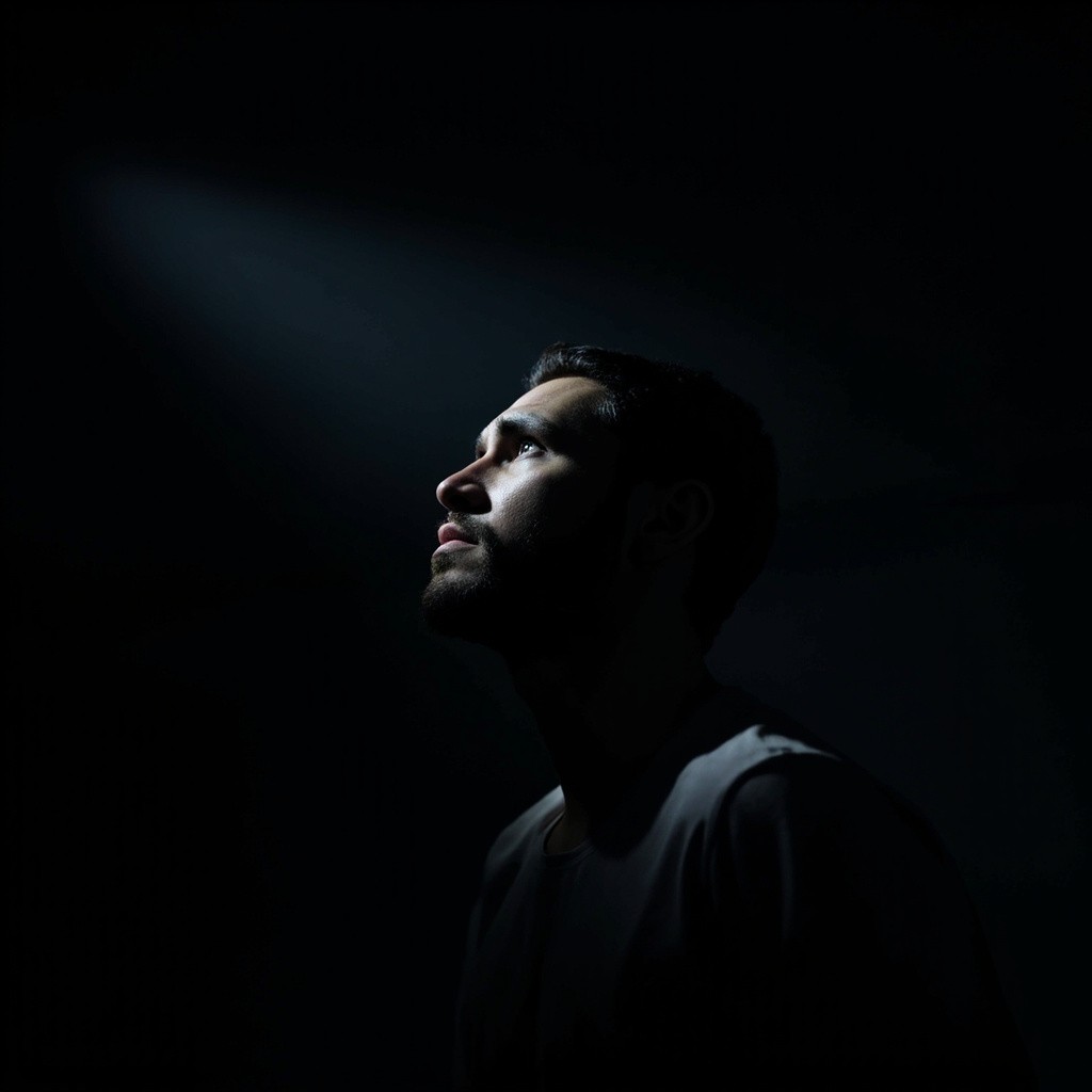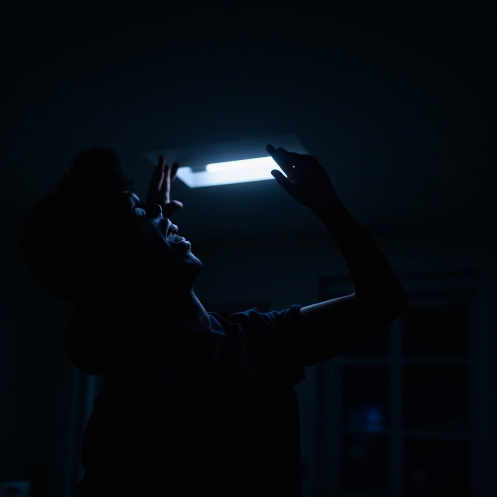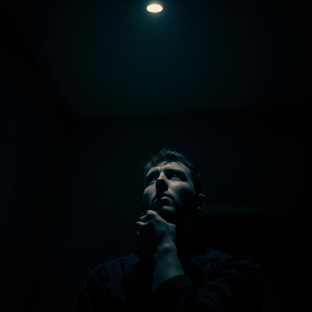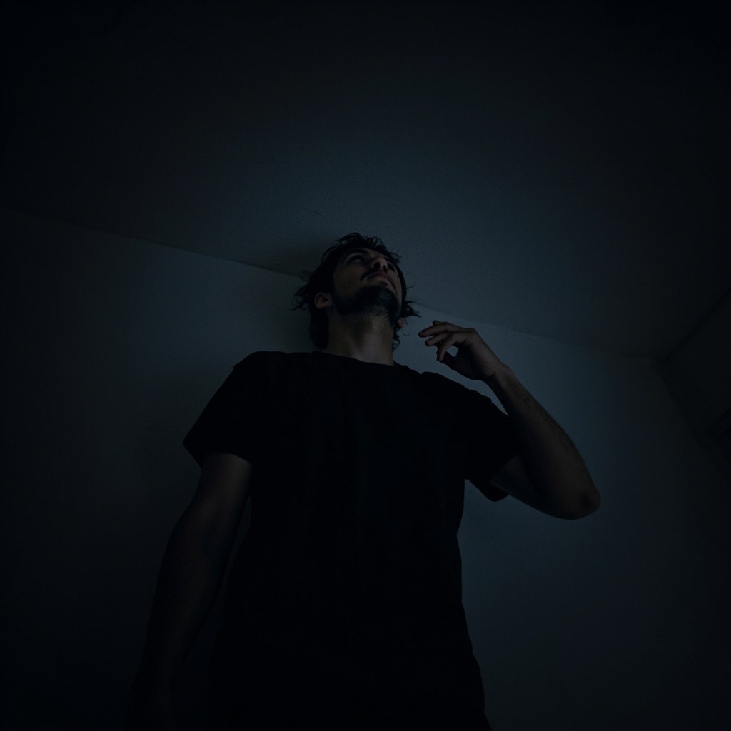 Person Staring at Ceiling in Dark Room with Intense Emotion