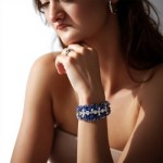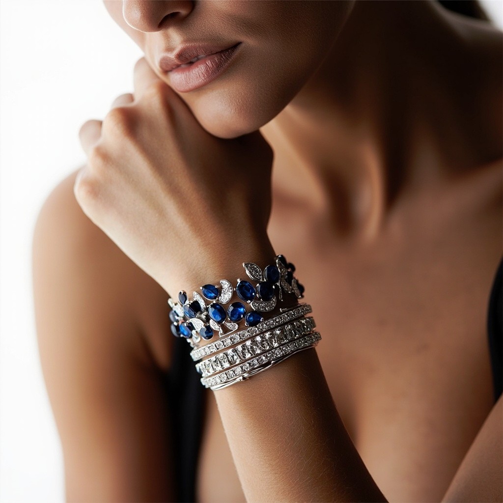 Modern Luxury Design: Person Wearing Platinum Bracelet with Sapphires and Diamonds on White Background