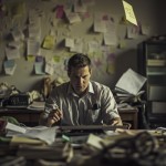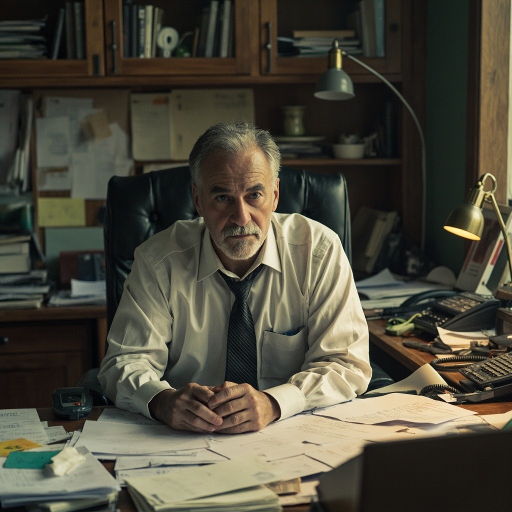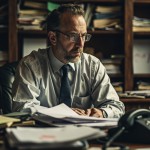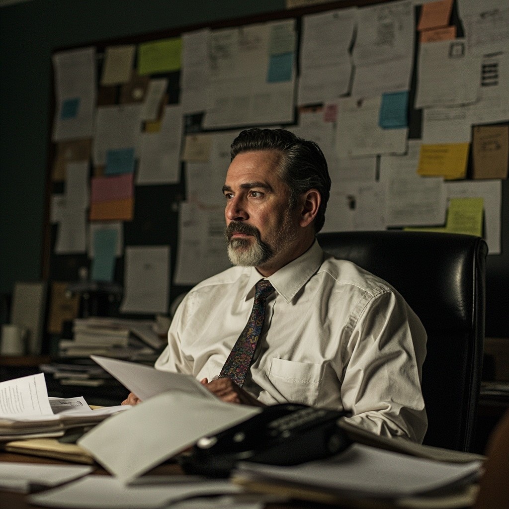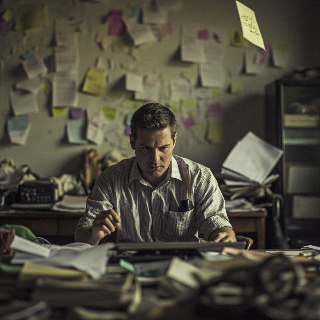 Man Sitting at Desk with Paper, Phone, and Notes Chaos