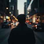 Candid Person Walking into Busy Dusk City Street with Glowing Lamps