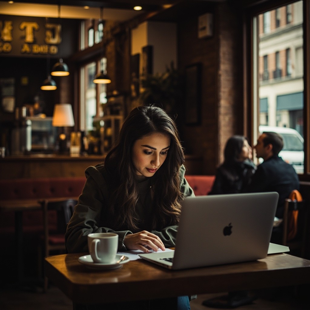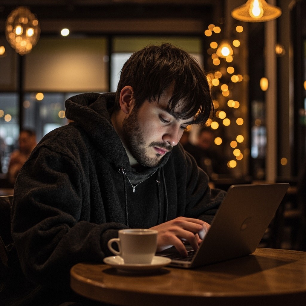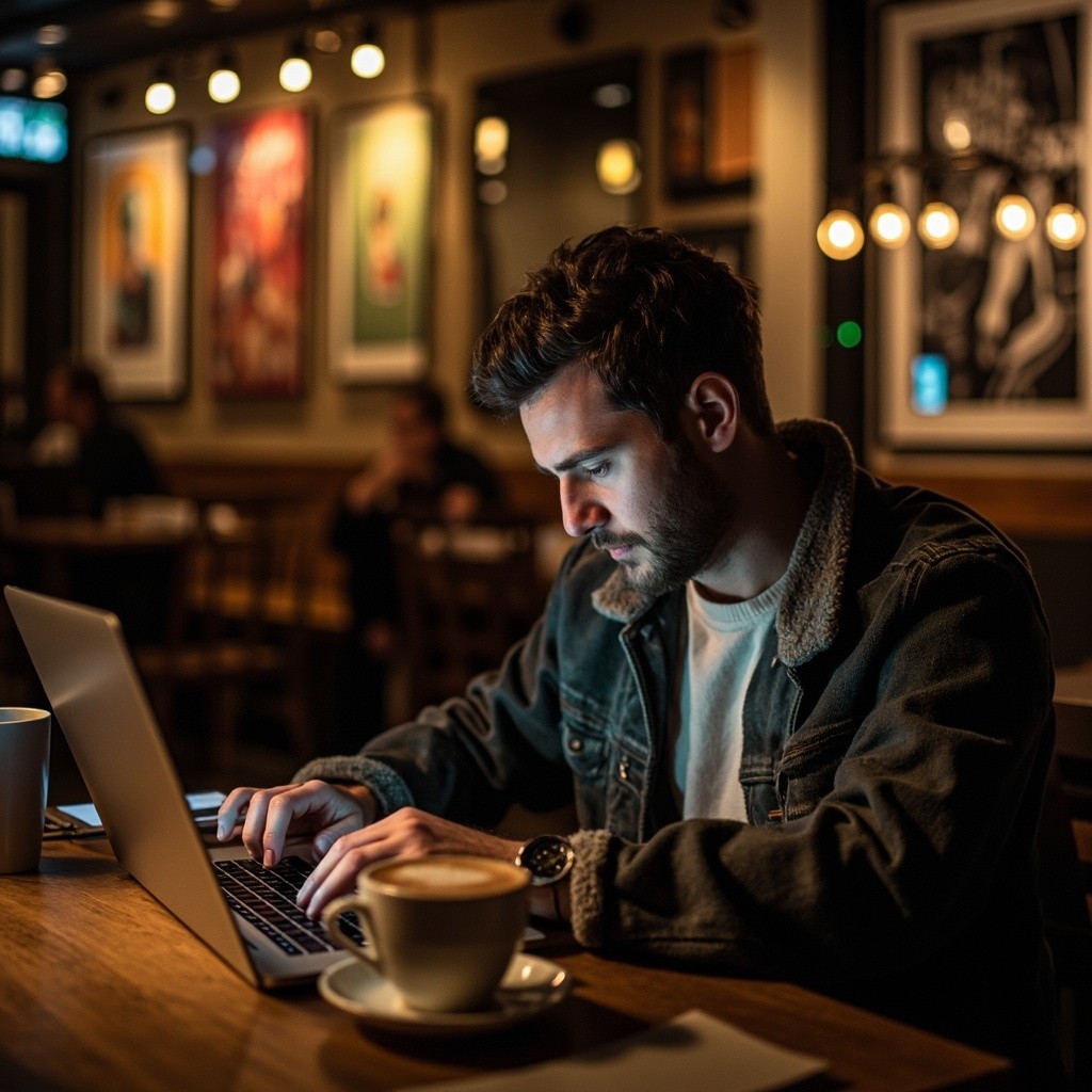 Café Interior with Music, Warm Coffee and Engrossed Laptop User