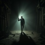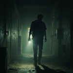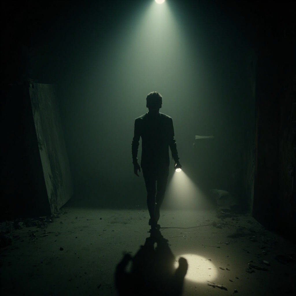 OThe camera represents a real human point of view walking slowly inside the same location. Movement is grounded and realistic: subtle vertical bob from footsteps, gentle side-to-side sway, imperfect handheld motion. The viewer is holding a flashlight; the beam reacts naturally to walking and turning with delayed movement, small overcorrections, uneven scanning. The character remains completely still and lifeless: no animation, no blinking, no breathing, no movement. Only environmental motion: floating dust, minimal light flicker, very subtle movement of loose elements. The environment stays consistent the whole shot: no set changes, no teleporting, no new objects. Photorealistic video, found-footage realism, handheld walking camera, low light, strong shadows, gritty textures, natural imperfections.