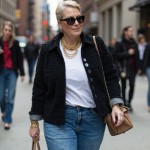 Plus Size Woman in Black Chanel Jacket and Bootcut Jeans Walking in City