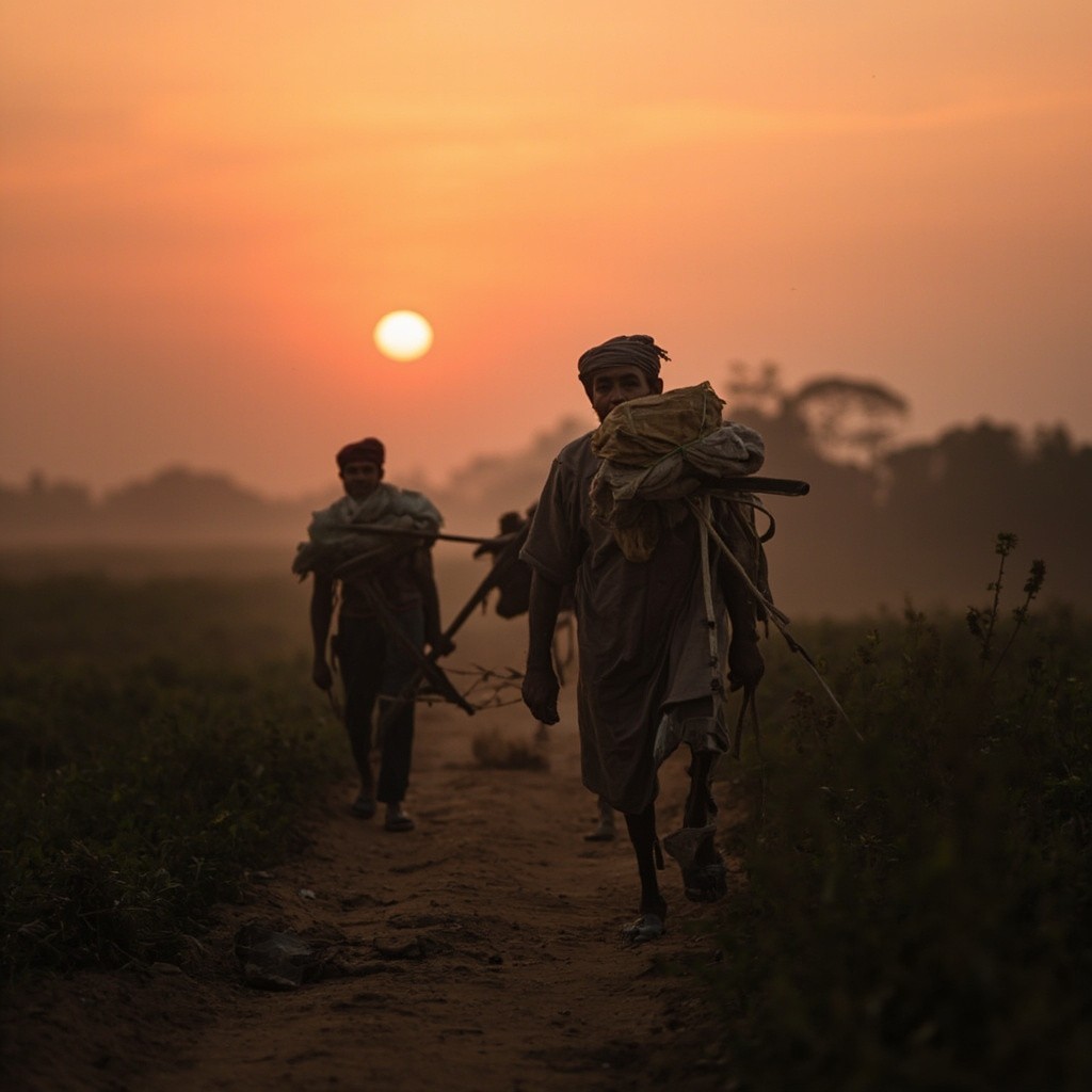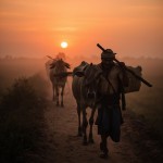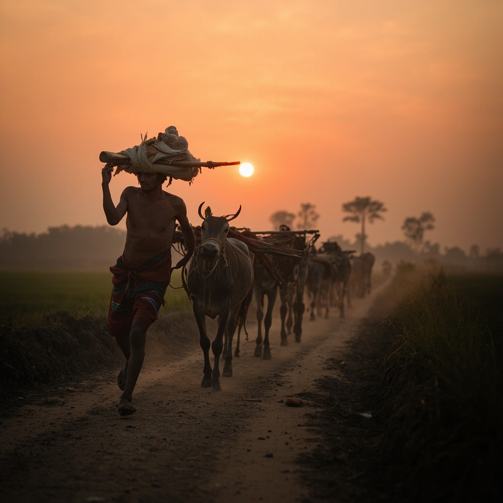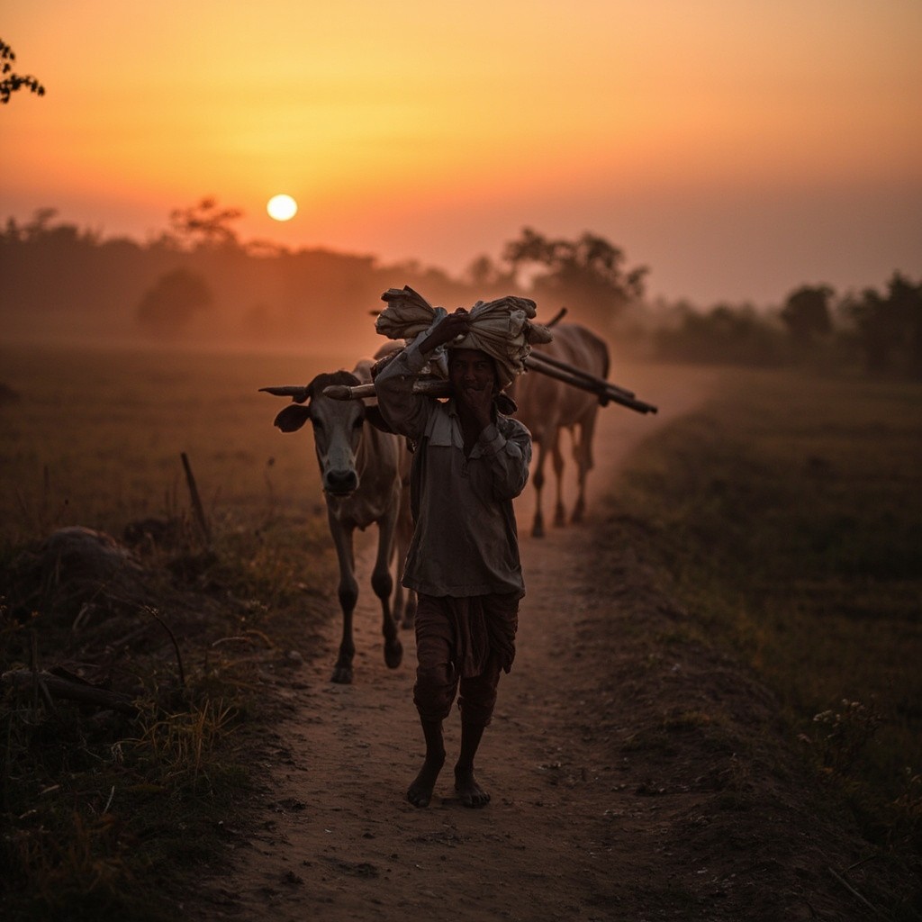 Poor Farmer Going to His Field with Oxen in Morning Light