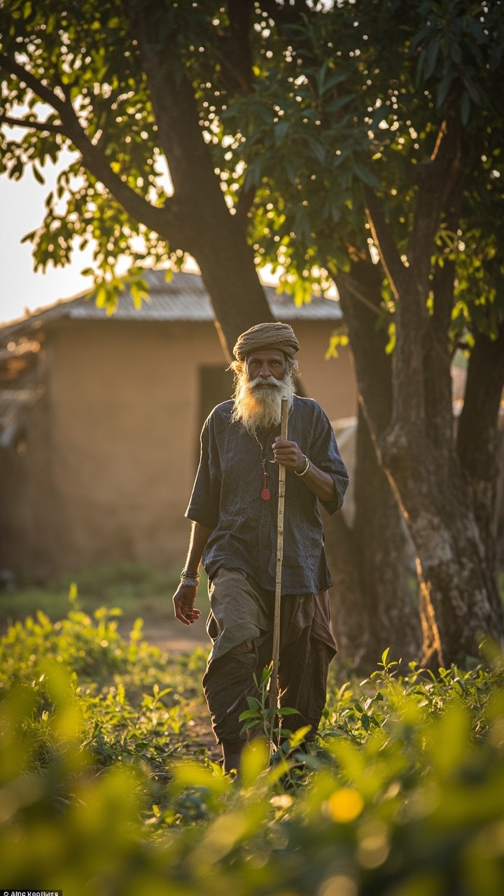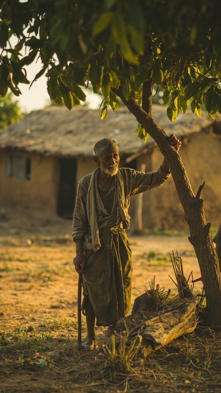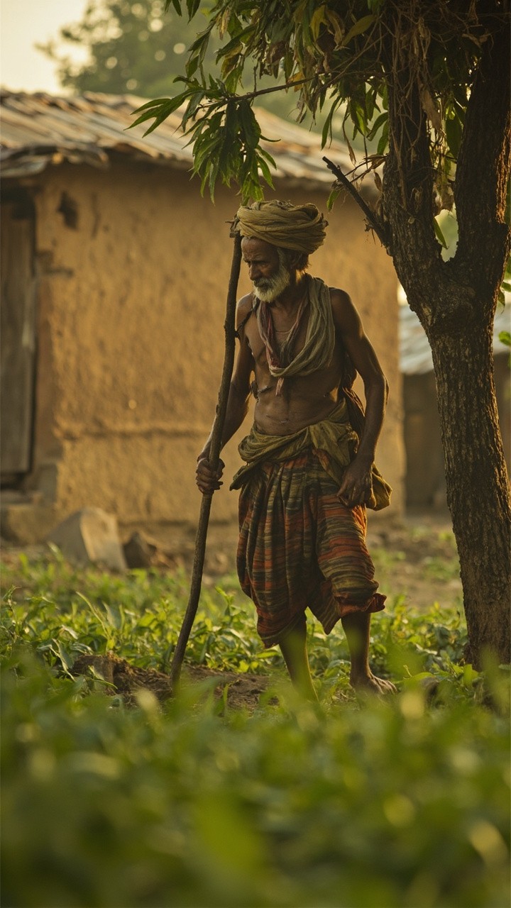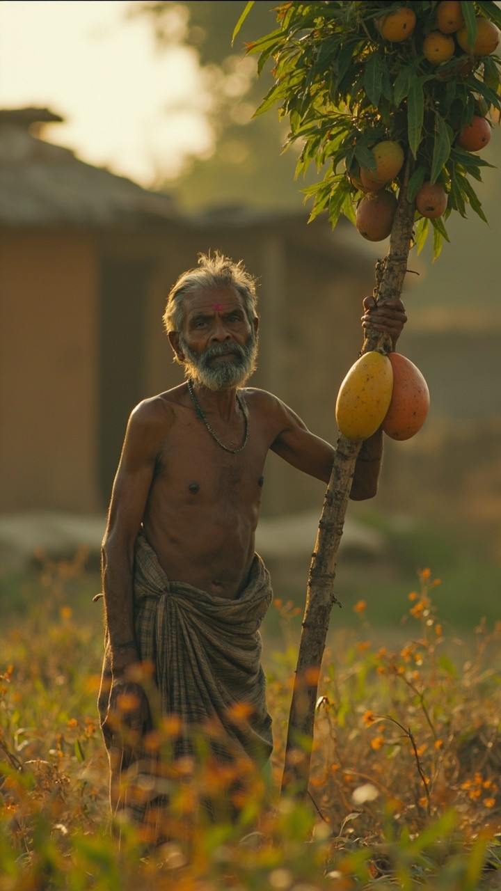 Indian Farmer Working in Field with Mango Tree, Rural Background