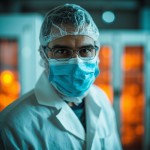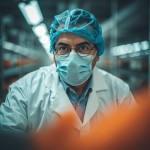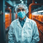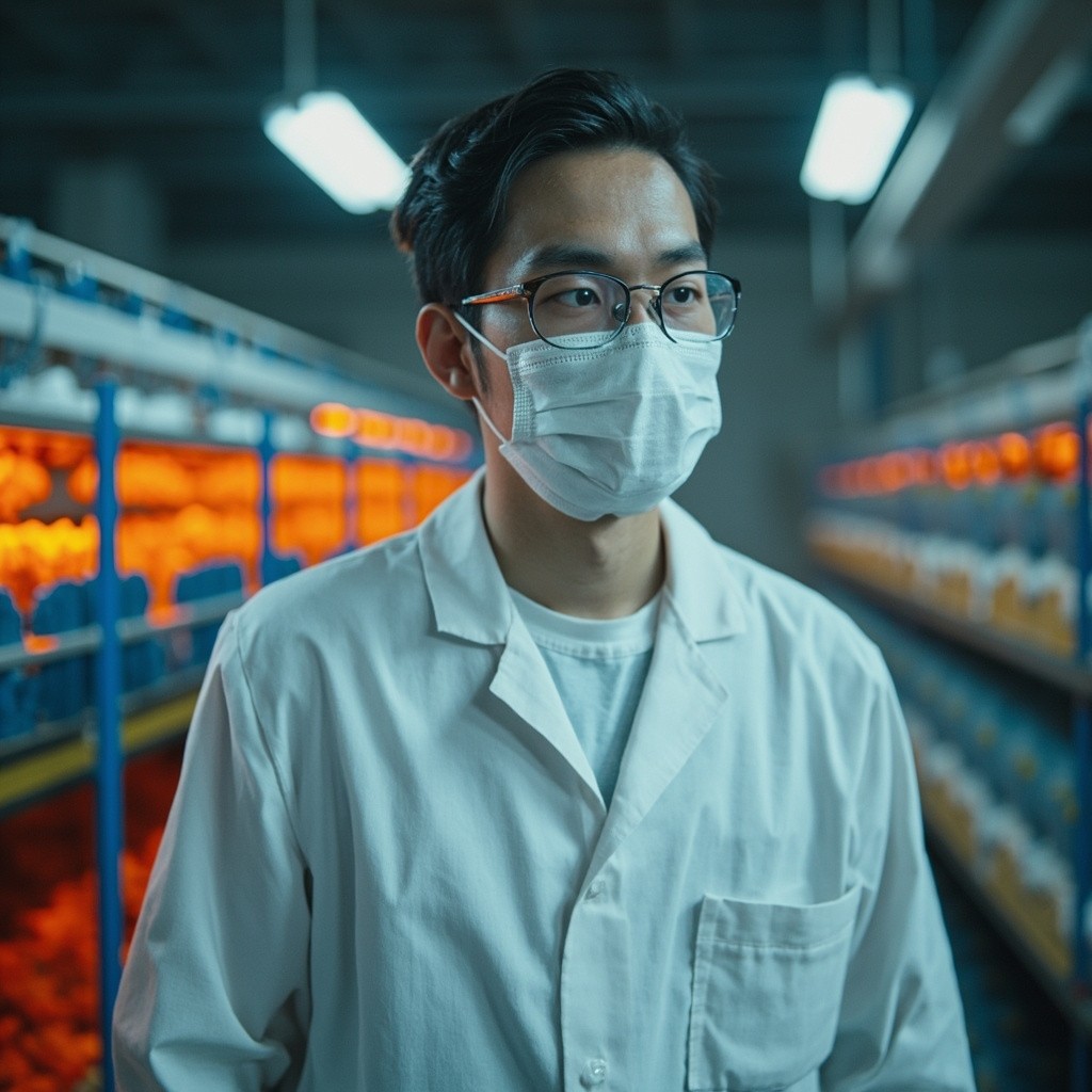 Poultry Factory Worker with Mouse on Face, White Coat, Orange and Blue Elements
