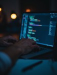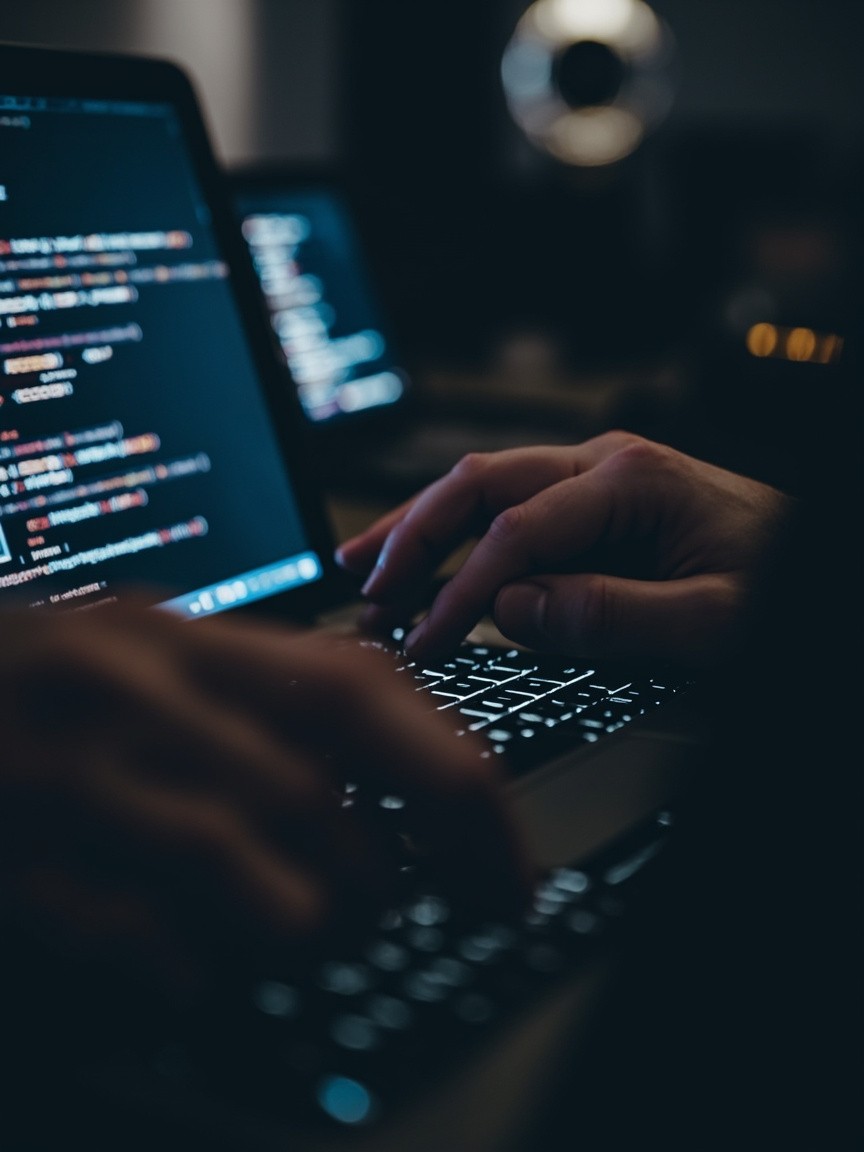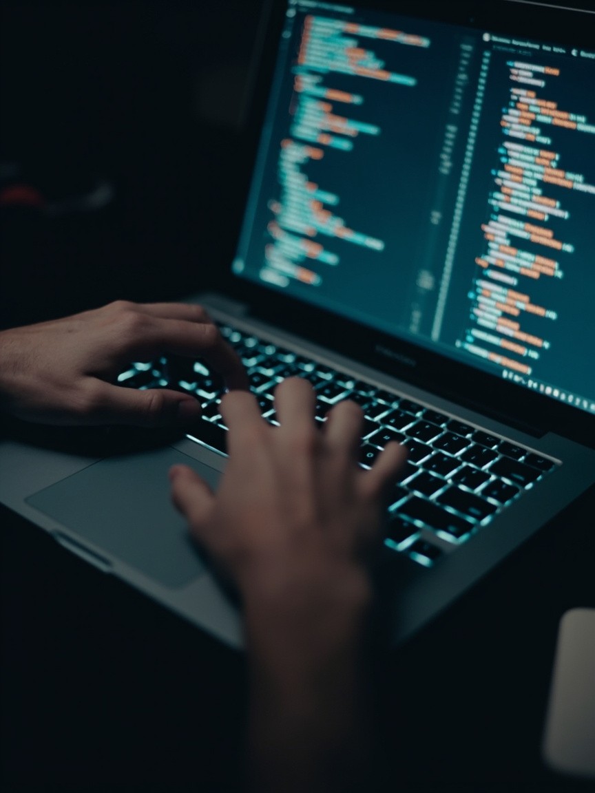 A close-up shot of a man coding on a laptop. Only the man's hands typing on the keyboard, the laptop, and the glowing code on the screen are visible. No face or body shown. The scene is modern, clean, and professional, with soft lighting and a tech-focused atmosphere. The image should look realistic, sharp, and suitable for a freelancer profile picture.